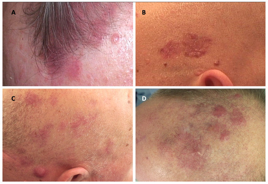 Scalp involvement in the course of PCLs may present a wide clinical presentation and mimic other neoplastic and inflammatory conditions. Knowledge of these presentations is crucial for clinicians. PCLs on the scalp may manifest as erythema, plaques, papules, nodules, and ulcerated/non-ulcerated tumors, which may or not be associated with alopecia [1,2,4,5,6,7,8,9,10,11,12,13,14,15,16,17,18,19,20,21,22,23,24,25,26,27,28,29,30,31,32,33,34,35,36,37,38,39,40,41,42,43,44,45,46,47,48,49,50,51,52,53,54,55,56,57,58,59,60,61,62,63,64,65,66,67,68,69,70,71,72,73,74,75,76,77,78,79,80,81,82,83,84,85,86,87,88,89,90,91,92,93,94,95,96,97,98,99,100,101,102,103,104,105,106,107,108,109,110,111,112,113,114,115,116,117,118,119,120,121,122,123,124,125,126,127,128,129,130,131,132,133,134,135,136,137,138,139,140,141,142,143,144,145,146,147,148,149,150,151,152,153,154,155,156,157,158,159,160,161,162,163,164]. Alopecia occurred in 69.0% of the analyzed patients.