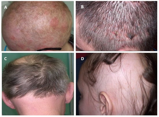Our analysis shows that lymphoma-associated hair loss may be an important issue when considering that a majority of patients with MF and SS (66.7% of patients in the 142 reviewed studies) had at least a sign of alopecia. In contrast, in the study analyzing data from the American registry of 1550 patients diagnosed with MF/SS, only 38 (2.5%) had alopecia related to a lymphoma [69]. Two main clinical presentations have been identified—in the minority of the analyzed patients (34%), lesions presented as patchy alopecia, clinically resembling alopecia areata, while, in other patients, hair loss occurred within the lymphoma lesions [69,138]. In rare cases of erythrodermic MF and SS, total body hair loss has been observed [69]. According to previous observations, in these cases, hair may regrow after treatment implementation [46,55,92,108,112].
