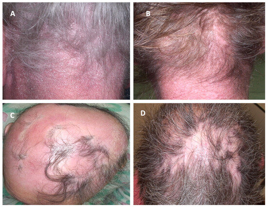 Clinical manifestations of cutaneous lymphomas affecting the scalp and their clinical mimickers. (A) Folliculotropic mycosis fungoides; (B) psoriasis; (C) folliculotropic mycosis fungoides; (D) alopecia areata.