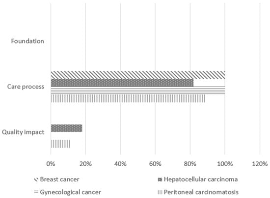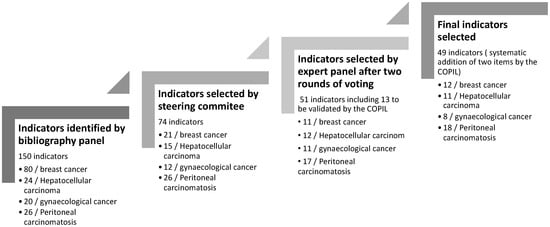 The bibliographic panels initially identified 150 indicators: 80 for breast cancer, 24 for hepatocellular carcinoma, 20 for gynecological cancer, and 26 for peritoneal carcinomatosis. Following discussions, the steering committee selected 74 potential indicators and submitted them to expert groups for content validation. Although the bibliographic panels worked independently, several QIs were common across all four cancer types, particularly those related to care relevance, delays between diagnosis and therapeutic procedures, treatment modalities, and management processes (Figure 1).