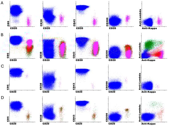 Representative immunophenotypic features of missed cases by DNN-only analysis. Clonal B cells in pink, polytypic kappa B cells in red, polytypic lambda B cells in green, T cells in blue, hematogones in orange. (A) CD5-negative clonal B cells; (B) CD5-positive clonal B cells, non-CLL-type; (C) CD5-positive clonal B cells, non-CLL-type; (D) CD5-positive clonal B cells, CLL type. The DNN-only detected 17 CLL events (less than 20-event cutoff for positivity, i.e. indetermindate or equivocal).