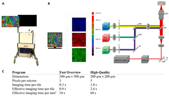 Images were acquired with a LabVIEW program (Flash Pathology B.V.), which had preset scanning programs with different fields of view and sampling densities, and therefore different acquisition times. The characteristics of the scanning programs are listed in Figure 1. The Fast Overview scan program was used to make an overview image of the entire sample. The High-Quality scan program was used to scan selected regions of interest (usually regions of 2 mm × 2 mm), often the cellular regions. Imaging time varied between 20 min and one hour and depended mostly on the surface area of the sample and the number of high-quality scans taken. The raw data contained signal intensities between 0 and 10,000 and were converted to 24-bit RGB images (8-bit for each color, i.e., intensities between 0 and 255). The signal intensities were scaled with a gamma correction in the LabVIEW program: γ = 0.5 for THG and SHG and γ = 0.7 for the 2PEF signal. The upper limit of the display range for each signal was manually determined to make sure that the cells and structures were well visible, without creating oversaturated images. Each signal is visualized in a different color: THG in green, SHG in red and 2PEF in blue. The images are a mixture of these colors. For example, collagen could generate SHG and THG, which resulted in an orange or yellow appearance in the HHGM images.
