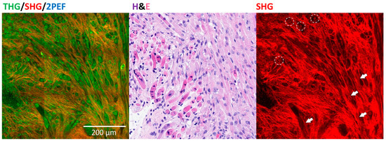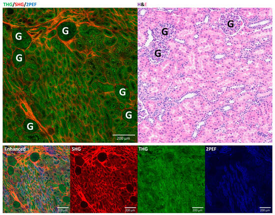 However, to the best of our knowledge, only one or two combinations of these HHGM imaging modalities have been explored for renal tissue, excluding THG, despite its ability to visualize almost all structural components of the tissue [8,9,10,11]. For example, Strupler et al. demonstrated that SHG can quantify renal interstitial fibrosis [14], while Best et al. showed that SHG can assess collagen density and alignment in renal cell carcinomas to distinguish between low-grade and high-grade tumors [15]. The combination of SHG and 2PEF has been used to image pediatric tumors, but these studies used formalin-fixed and paraffin-embedded tissue [16,17].