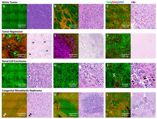 Comparison of HHGM images and H&E for Wilms tumor, renal cell carcinoma and congenital mesoblastic nephroma. Wilms tumor is a heterogeneous tumor and consists of three different components. The blastemal component (A) is cellular and is mostly visualized in the THG channel. The epithelial component (B) shows cells arranged in tubular structures. The stromal component (C) may have rhabdomyoblastic differentiation as shown in this case; the rhabdomyoblasts are round and have a large cytoplasm, and the more differentiated rhabdomyoblasts are elongated and sometimes have a visibly striated sarcoplasm, which is better shown in Figure 4. Examples of tumor regression (D–F) show dense fibrosis and foamy macrophages (annotated as M), which are prominent in the HHGM image (D); hemosiderin pigments create a strong 2PEF signal in the HHGM images (E); necrosis shows unrecognizable structures with no clear tissue architecture (F). Renal cell carcinoma shows some papillary arrangement (G) and hyaline structures (H), and a close-up (I) shows psammoma bodies (circled) and cells with a prominent nucleolus (arrows). Congenital mesoblastic nephroma shows fascicular patterns of spindle-shaped cells (in (J), orientation of the bundles is indicated with an arrow), cellular areas (K) and entrapped renal tubules ((L), annotated with *).
