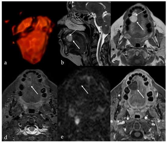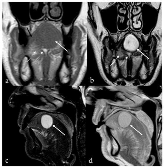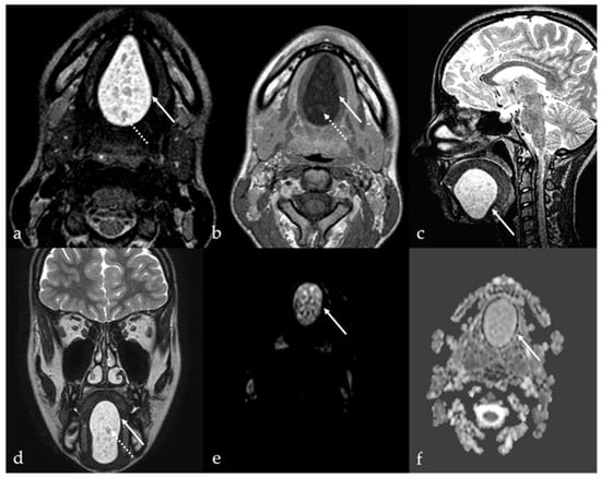 - Giarraputo, L.; Savastano, S.; D’Amore, E.; Baciliero, U. Dermoid Cyst of the Floor of the Mouth: Diagnostic Imaging Findings. Cureus 2018, 10, e2403. [Google Scholar] [CrossRef] [PubMed]