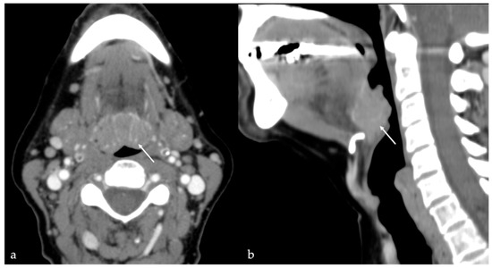 | Lingual tonsillitis in infectious mononucleosis [18] | CT, MRI: symmetric tonsil enlargement, retention cysts, and “linear or columnar pattern” of enhancement (features of benign tonsillar hypertrophy) | Lingual tonsil lymphoma |