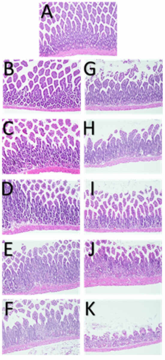 Histology of small intestine 3 days after C57BL/6J mice were TBI-treated. Typical tissue damage was observed in response to radiation in a dose-dependent manner. (A) Control (top center); (B–F) PLDR (left column); (G–K) CRT (right column). Marked increase in severity of atrophy and adenomatous hyperplasia was observed in CRT groups for the same dose when compared to PLDR. H&E staining; magnification ×100.