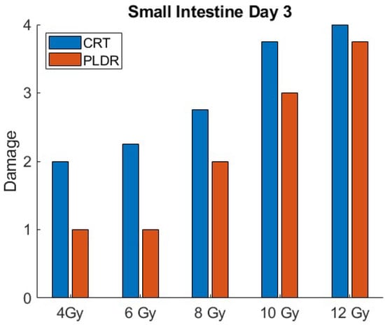 Small intestine tissue toxicity for different doses of CRT and PLDR at day 3.