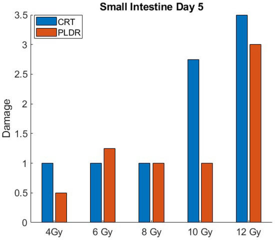 Small intestinetissue toxicity for different doses of CRT and PLDR at day 5.