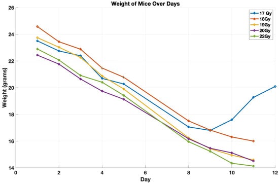 After administering the designated radiation doses, we tracked the weight and survival of the mice. In groups receiving up to 17 Gy, an initial weight loss was observed, but these mice started regaining weight after 10 days and ultimately survived. In contrast, the groups exposed to 18 Gy or higher of CRT demonstrated a persistent decrease in weight, leading to their eventual death. The weight loss for each group for the whole-abdomen treatment for doses 17 Gy and higher is detailed in Figure 5. The outcomes of this experiment of CRT indicate that 18 Gy represents the , the dose level at which all subjects died. Figure A1 in Appendix A shows the detailed histological report.