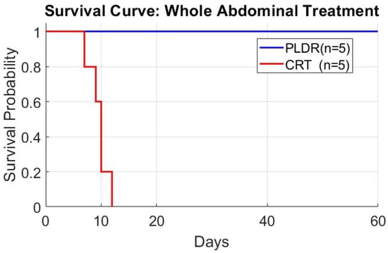 Survival curve of whole-abdominal 18 Gy treatment for PLDR (n = 5) and CRT (n = 5).
