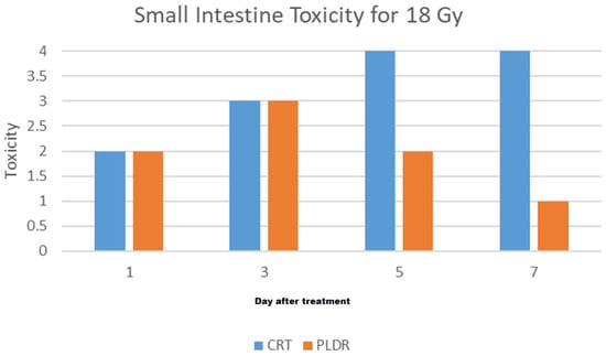 Small intestine tissue toxicity for 18 Gy of PLDR and CRT 1, 3, 5, and 7 days after treatment.