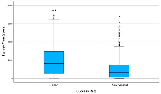 Distribution of storage duration (in days) according to sequencing success rate (SSR). Successfully sequenced samples (SSR = 1) had a significantly shorter median storage time (657 days; IQR: 122.5–1498) compared with failed samples (SSR = 0), which had a median storage duration of 1626.5 days (IQR: 557–2956). The difference in storage times between groups was statistically significant (*** indicates p < 0.001 (Mann–Whitney U test)). The failed group also exhibited greater variability and more extreme outliers, indicating that longer storage durations were associated with sequencing failure.