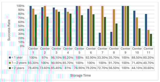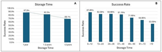 Storage duration had a notable effect on SSR. Long-term storage (>2 years) was associated with a significant reduction in the SSR (OR, 0.36; 95% CI, 0.26–0.50; p < 0.001), indicating an inverse correlation between storage time and SSR. Conversely, short-term storage (<1 year) was significantly associated with a higher SSR (OR 2.8, 95% CI 1.92–4.11, p < 0.001). As depicted in Figure 2A, SSR was 87.8% (274/312) for samples stored for <1 year, 82.3% (116/141) for those stored between one and two years, and it dropped to 69.1% (346/501) for samples stored >2 years. Pairwise proportion tests revealed significant differences in success rates across storage time intervals. The SSR after 2 years was significantly lower than the SSR for short-term (69.1% vs. 87.8%, p < 0.001) and middle-term storage samples (69.1% vs. 82.3%, p = 0.002). The difference between samples stored short-term and middle-term (87.8% vs. 82.3%) was not significant (p = 0.114). These findings highlight a notable decline in the SSR over time, particularly beyond 2 years of storage.