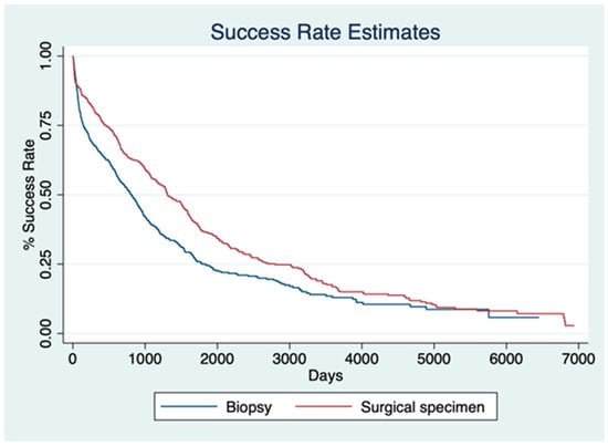 Kaplan–Meier curves illustrating success rate (SSR) estimates over time for biopsy (blue) and surgical specimen (red) groups. Patients with biopsy samples had a significantly lower hazard for SSR compared with those with surgical specimens (HR = 0.7362; 95% CI: 0.5810–0.9328; p = 0.011). The log-rank test confirmed a significant difference in SSR distributions between the two cohorts (p < 0.001).