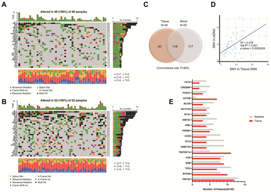 Mutational profile of DNA in tumor (A) and plasma (circulating-tumor DNA [ctDNA]; (B) samples of the 52 patients with diffuse large B-cell lymphoma (DLBCL). Each column represents one tumor/plasma sample, and each row represents one gene. Mutations in the heatmap described all the identified mutations including tier 1 to tier 3. Mutations identified in tumor and plasma samples from individual DLBCL patients showed 74.68% concordance (C); the correlation between mutations identified in tumor tissue and plasma is shown in (D); the frequency of 19 major mutations in plasma and tumor samples are presented in (E).