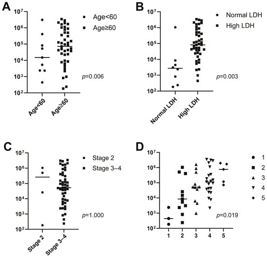 The median concentration of baseline ctDNA was 513.0 hGE/L (range 0.2–3425.2 hGE/L). Baseline ctDNA concentration was associated with several clinical prognostic factors (Figure 2): baseline ctDNA concentration was higher in patients with high serum LDH concentrations than in patients with normal LDH concentrations (82.3 hGE/L [range 0.0–3425.2 hGE/L] vs. 2.7 hGE/L [range 0.2–1040.0 hGE/L], respectively; p = 0.003). Patients older than 60 years had higher baseline ctDNA concentrations than younger patients (14.9 hGE/L, range 0.4–3095.3 hGE/L vs. 72.1 hGE/L, range 0.0–3425.2 hGE/L, p = 0.006). Baseline ctDNA concentrations were also greater in patients with higher IPI scores (IPI 1, 0.4 hGE/L, range 0.2–2.4 hGE/L; IPI 2, 8.5 hGE/L, range 0.2–1040.0 hGE/L; IPI 3, 51.4 hGE/L, range 0.0–1624.0 hGE/L; IPI 4, 115.0 hGE/L, range 2.2–3425.2 hGE/L; IPI 5, 769.7 hGE/L, range 72.1–1973.6 hGE/L, p = 0.019). However, baseline ctDNA concentrations did not differ significantly between Stage 2 and Stage 3–4 patients (Stage 2, 263.3 hGE/L, range 0.0–3425.2 hGE/L; Stage 3–4, 2.8 hGE/L, range 0.2–1040.0 hGE/L, p = 1.000).