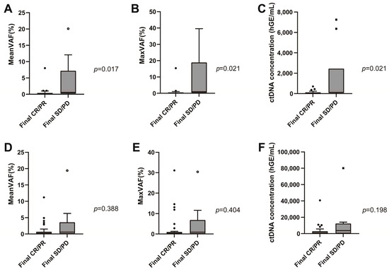 Interim and EOT plasma samples were obtained in 51 and 48 patients, respectively. The median interim plasma ctDNA concentration was 0.1 hGE/L (range 0.0–7.3 hGE/L), and the median EOT ctDNA concentration was 0.5 hGE/L (range 0.0–80.2 hGE/L). Mean and maximum interim VAF values were significantly lower in the responder group patients than the non-responder group patients (interim meanVAF, 0.2, range 0.0~8.0 vs. 0.6, range 0.0~20.1, p = 0.017; interim maxVAF, 0.3, range 0.0–15.4 vs. 1.0, range 0.0–39.6, p = 0.021) (Figure 3A,B). However, there was no difference between the responder and non-responder groups with respect to EOT VAF (EOT meanVAF 0.2, range 0.0–11.2 vs. 0.6, range 0.0–19.4, p = 0.388; EOT maxVAF, 0.3, range 0.0–31.1 vs. 0.9, range 0.0–30.4, p = 0.404; see Figure 3D,E). Similar results were obtained in the ctDNA concentration analysis. The median interim ctDNA concentration was lower in the responder group than in the non-responder group (0.1 hGE/L, range 0.0~0.7 hGE/L vs. 0.1 hGE/L, range 0.0~7.3 hGE/L, p = 0.021) (Figure 3C). There was no difference between the responder and non-responder groups for median EOT ctDNA concentration (0.4 hGE/L, range 0.0~40.6 hGE/L vs. 3.7 hGE/L, range 0.0~80.1 hGE/L, p = 0.198) (Figure 3F).