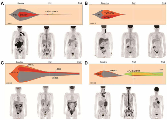 Representative cases emphasizing the clinical usefulness of ctDNA as a response assessment tool complementary to positron emission tomography/computed tomography (PET/CT). The first two cases show concordant results between the interim PET/CT response and the ctDNA response assessment. Those patients are being followed up without relapse (A,B). In case C, the patients achieved an interim complete metabolic response in PET/CT but the interim ctDNA analysis result showed the persistence of driver mutations which was identified at pretreatment. The patient experienced disease relapse at the final response assessment (C). The last case also presents the interim complete metabolic response with bone marrow reactivation. However, new mutations which were not identified in the pretreatment sample were identified and persistently identified in the final sample, and the final PET/CT revealed disease relapse (D). In Figure 1D, F/U1 and F/U2 were applied at a magnified scale (20×).