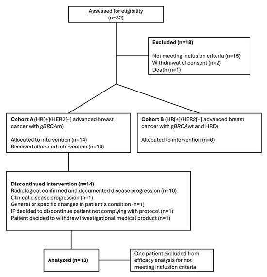 Eligible patients included men and pre-/post-menopausal women aged 18 or older with HR[+]/HER2[–] advanced breast cancer who were not candidates for curative intent and had a deficiency in the HRR pathway. Participants had evidence of either measurable or evaluable disease as per the Response Evaluation Criteria in Solid Tumors (RECIST) version 1.1. Participants included in cohort A exhibited a gBRCAm, and exploratory cohort B patients exhibited gBRCAwt and an HRD based on the Myriad myChoice® CDx PLUS test.