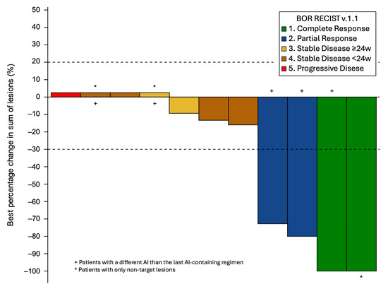 Waterfall plot of the best change from baseline in tumor lesions according to the best objective response. Abbreviations: AI: aromatase inhibitor; w: weeks.