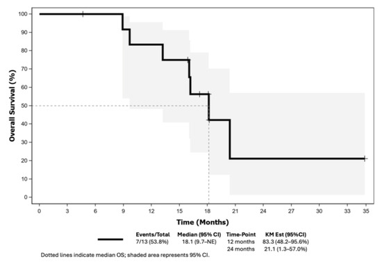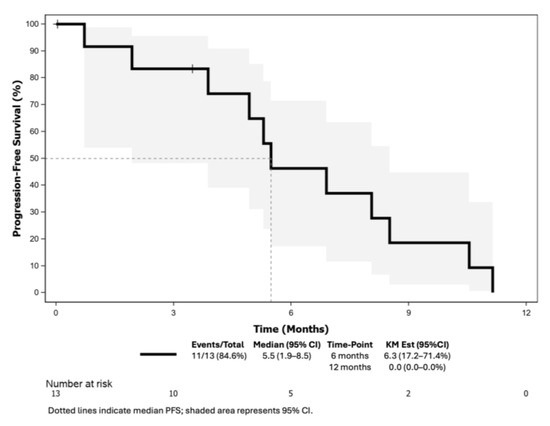 At the data cutoff (14 November 2023) for final analysis, no patient remained on treatment, with progressive disease (78.6%) as the main reason for treatment discontinuation. The median duration of follow-up was 16.7 months (range: 13.2–18.2). One patient was excluded from the efficacy analysis due to no prior AI treatment.