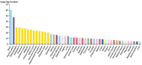 RNA expression level of TSGA10 in different human tissues (courtesy of the open-source The Human Atlas Protein [26]). Colors indicate tissue types, with male reproductive being light blue and neuronal being yellow.
