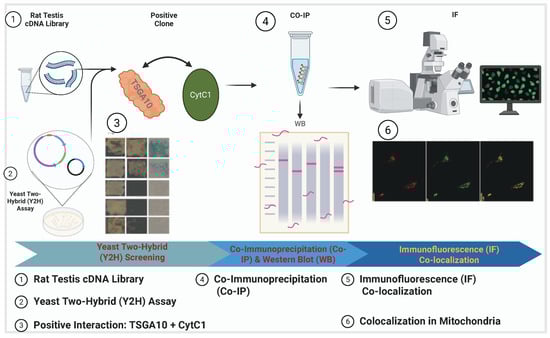 TSGA10 protein association with mitochondria in NIH3T3 cells. This schematic outlines the experimental workflow to demonstrate TSGA10’s association with mitochondria, where TSGA10 interacts with CytC1. The process includes a yeast two-hybrid (Y2H) assay; TSGA10 is used as the bait protein to screen a testis cDNA library, leading to the identification of CytC1 as an interacting partner. Then, the interaction is validated in mammalian cells through co-immunoprecipitation (CO-IP) followed by Western blot (WB); CytC1 antibody is used for immunoprecipitation, and the presence of TSGA10 in the complex is confirmed using TSGA10 and GFP antibodies during WB. Finally, a immunofluorescence (IF) colocalization study isperformed to visualize the subcellular localization of TSGA10 and CytC1 in mitochondria. Together, these experiments confirm the physical interaction and mitochondrial co-localization of TSGA10 and CytC1.