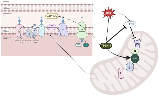 Previous work has shown that TSGA10 also interacts with HIF-1 [6]. This positions TSGA10 as an oxysensor or member of the oxygen sensor complex protein, including HIF-1, Complex III (bc1 complex), intermediate filament network, and TSGA10 itself, to modulate an appropriate response to stress and hypoxia. The mitochondrial Complex III regulates hypoxic activation of HIF-1 via enabling cells to sense hypoxia. Under normoxic conditions, HIF-1 is rapidly degraded by prolyl hydroxylases (PHDs), which require oxygen as a substrate. However, during hypoxia, Complex III of the electron transport chain generates ROS as a byproduct of incomplete oxygen reduction. These ROS inhibit PHD activity, stabilizing HIF-1 and allowing it to translocate to the nucleus. There, HIF-1 dimerizes with HIF-1, activating the transcription of genes involved in angiogenesis, metabolism, and survival, thereby enabling cellular adaptation to hypoxia [44]. Given our hypothesis that TSGA10 directly affects electron transfer either to cytochrome c or oxygen (thereby generating the ROS involved in HIF-1 activation), it is positioned to be a direct player in the process of oxygen sensing by HIF-1 and Complex III.