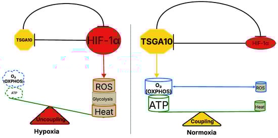HIF-1 is a key regulator of cellular adaptation to hypoxia, promoting glycolysis while suppressing OXPHOS [51]. The shift into glycolysis allows cells to generate ATP under low-oxygen conditions but reduces mitochondrial efficiency overall because less ATP is generated per input glucose molecule. But HIF-1 is not just activated by hypoxia: it responds to temperature also. One study on kidney tissue demonstrated that HIF-1 is significantly upregulated during cold ischemia, promoting cellular adaptations that enhance survival under low-temperature stress [52]. Another noted that HIF-1 mediates the response of skeletal muscle to cold stress [53]. These data suggest a thermal equilibrium, because TSGA10 regulates HIF-1, suppressing its expression [2,6,7]. Furthermore, data support the counter-regulatory effect of HIF-1 acting as a suppressor of TSGA10 expression [32]. This mutual regulation makes for a tightly linked feedback loop, maintaining metabolic homeostasis and linking oxygen, ATP, and thermoregulatory roles (Figure 4).