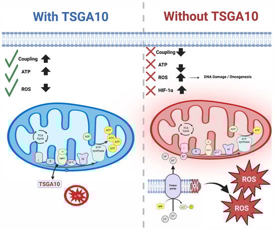 Cancer cells exhibit metabolic plasticity, adapting their energy production depending on microenvironmental conditions such as hypoxia or nutrient stress. In some cases, tumors exploit mitochondrial uncoupling to minimize ROS accumulation, thereby preventing oxidative damage and supporting survival [61]. Given TSGA10’s hypothesized role in promoting mitochondrial coupling, its downregulation in cancer may facilitate a shift toward glycolysis, favoring the Warburg effect, where cancer cells preferentially use glycolysis over OXPHOS, even in the presence of oxygen [2]. Indeed, it has been suggested that it is the uncoupling of mitochondrial OXPHOS that drives the shift toward aerobic glycolysis of cancer cells [62] (Figure 5).