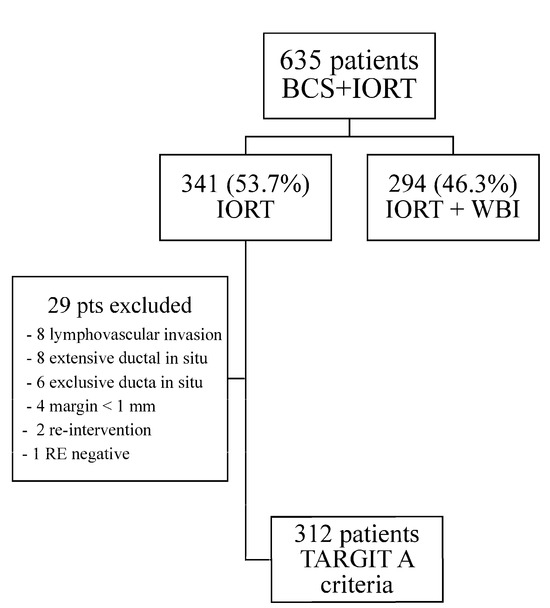 After surgery, all patients were re-discussed at the multidisciplinary tumor board of each participating center. After a definitive pathology report, exclusion criteria included risk factors recommending complementary external radiotherapy, such as surgical margin < 1 mm, any resection after IORT, lymphovascular invasion, lobular histology, extensive ductal in situ component, and nodal involvement (pN1).