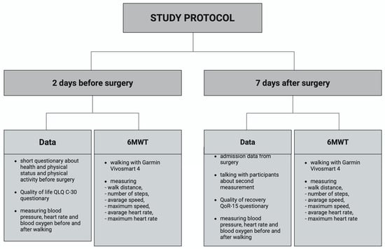 We used the Garmin Vivosmart 4. The Garmin Vivosmart 4 is a wrist-worn activity tracker. It is based on an accelerometer that tracks steps, distance, heart rate, calories, floors climbed, and minutes of intense exercise. It also has a built-in display for direct control and data reading. The data can be analyzed later using the Garmin Connect mobile app version 5.13.0.27. Metric values were used to configure the device for the purposes of this study. The device was also configured to be worn on the left wrist and was placed proximal to the Caput ulnae sinistra for each subject, according to the manufacturer’s recommendations [42]. A study [42] was conducted to assess the validity of the Garmin Vivosmart device while walking at different speeds under controlled conditions. The results showed a tendency for the Garmin Vivosmart to count fewer steps compared to a manual pedometer. Despite these results, the activity tracker may still be clinically relevant at certain walking speeds. The study showed that the Garmin Vivosmart counted steps incorrectly at low and high speeds. We concluded that the Garmin Vivosmart is valid at 3.2 to 4.8 km/h speeds. Another paper discusses [43] how reliable such devices are at moderate walking speeds. A 2017 study reveals the validity of wearable devices in measuring heart rate compared to six-lead ECGs [44]. One of the wearable devices was also more accurate in measuring heart rate at rest and at lower exercise intensities. The Garmin Vivosmart HR was also found in the group of reliable devices at rest and lower exercise intensities. Since we used walking in our study (a very low-intensity exercise), we can conclude that there was no significant deviation from the wearable monitor. On the other hand, the same study confirmed that the chest-based wearable monitor had the smallest deviation from the six-lead ECG, and this may be a recommendation for using such a device in future studies. This device has not been validated on surgical or oncology patients, which is a significant limitation of this study.