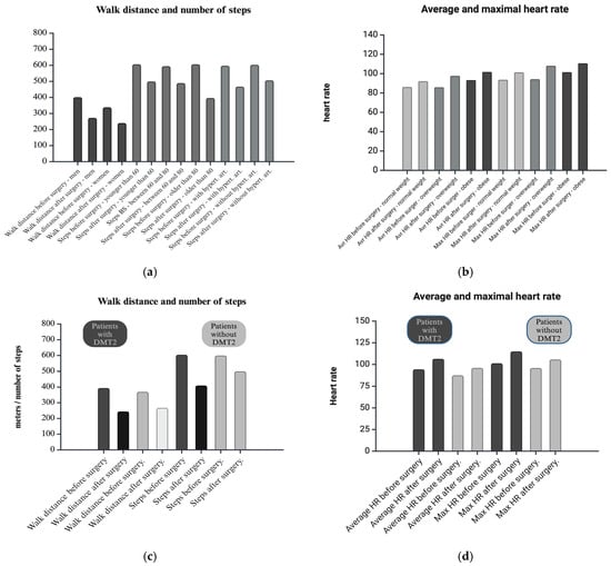 The data presented in this study show that postoperative patients had a higher maximum and average heart rate during the 6MWT. The average heart rate during walking was higher in overweight and obese people. It should be noted that people living with obesity had significantly higher heart rates before surgery. The situation was similar with the maximum heart rate during the 6MWT. It is important to note here that people with arterial hypertension and ischemic heart diseases did not show a significant difference in average and maximum heart rate during walking before and after surgery. The reason may be the use of beta-blockers in pharmacologic therapy (all 16 participants with beta-blocker therapy were in the arterial hypertension group). Postoperatively, the average and maximum walking speed was lower, especially in patients with DMT2. All results are shown in Figure 2a–d.