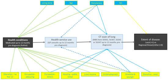 Bivariate analyses of local stage and the three predictor variables were investigated initially in cross-tabulations with each sociodemographic and health variable. Initial indications of associations were inferred from “p values” < 0.05. Separate multivariable models for the principal and other predictor variables were undertaken using least-squares linear models for those measured on a continuous scale and logistic models for CT scans as a binary variable. Local stage as a binary outcome variable was also analyzed by logistic regression. All potential covariates related to the main variables at a bivariate level (p < 0.10) were simultaneously evaluated in our models. Variables were purposefully removed stepwise when they did not contribute to statistically significant associations in the structural equation modelling (i.e., p ≥ 0.05). We refitted models with remaining covariates until a main effects model was derived, where each retained covariate contributed to model fit. Our structural modelling included directional relationships based on empirical evidence of numbers of medicated health conditions, GP contacts, and CT scanning as potential predictors of the likelihood of diagnosis at a local stage [18,28].