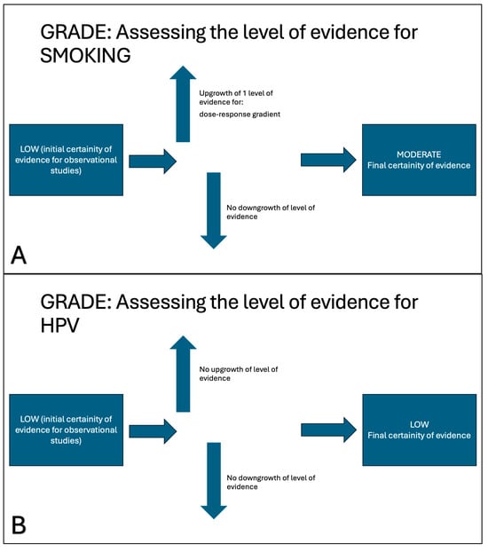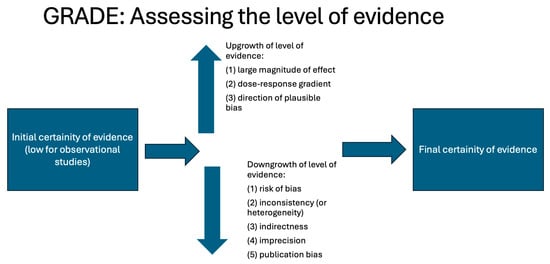 - Murad, M.H.; Verbeek, J.; Schwingshackl, L.; Filippini, T.; Vinceti, M.; Akl, E.A.; Morgan, R.L.; Mustafa, R.A.; Zeraatkar, D.; Senerth, E.; et al. GRADE GUIDANCE 38: Updated Guidance for Rating up Certainty of Evidence Due to a Dose-Response Gradient. J. Clin. Epidemiol. 2023, 164, 45–53. [Google Scholar] [CrossRef]