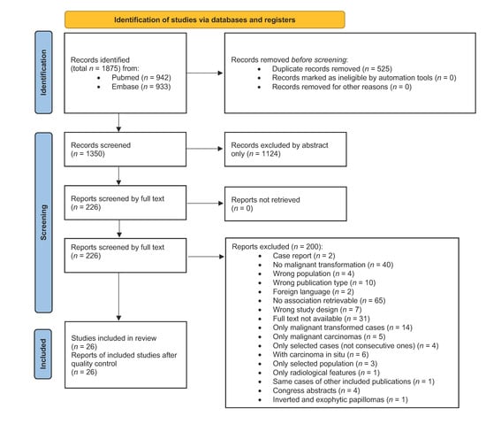 Ambrosini-Spaltro A, Querzoli G, Leucci AC, Camagni A, Farneti P, D’Angelo E, Donini E, Tosoni A, Pasquini E, Galli P, et al. Risk Factors for Malignant Transformation in Inverted Sinonasal Papilloma: A Systematic Review and Meta-Analysis. Cancers. 2025; 17(11):1798. https://doi.org/10.3390/cancers17111798
