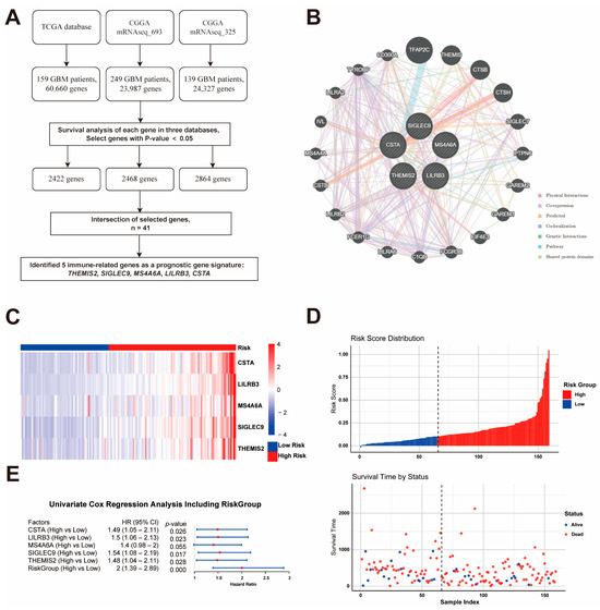 Identification and Validation of the Prognostic Gene Signature. (A) Workflow for identifying five immune-related prognostic genes (THEMIS2, SIGLEC9, CSTA, LILRB3, and MS4A6A) from three GBM datasets. (B) Gene interaction network showing functional connections among the five genes and key immune regulators. (C) Heatmap of gene expression in high- and low-risk groups based on risk score. (D) Risk score distribution and survival status. (E) Cox regression analysis confirming the prognostic significance of the gene signature.