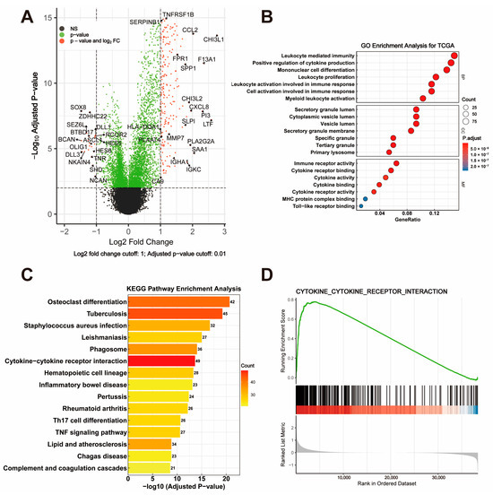 Visualization and Functional Enrichment Analysis of DEGs. (A) Volcano plot displaying differentially expressed genes (DEGs) between high-risk and low-risk groups, with criteria set at |log2 fold change| > 1 and adjusted p-value < 0.01. (B) GO enrichment analysis of DEGs, categorized into biological process (BP), cellular component (CC), and molecular function (MF). (C) KEGG pathway enrichment analysis highlighting significant pathways involving DEGs. (D) GSEA plot showing enrichment of the cytokine–cytokine receptor interaction pathway.