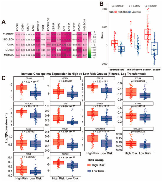Immune Checkpoint Correlation and Tumor Microenvironment Characteristics. (A) Correlation analysis of the gene signature with immune checkpoints. (B) Comparison of StromalScore, ImmuneScore, and ESTIMATEScore between high-risk and low-risk groups. (C) Expression levels of immune checkpoint molecules in high-risk and low-risk groups.