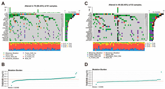 To compare the genomic alterations between the high- and low-risk groups, we analyzed the mutation landscape and tumor mutation burden of each group using the TCGA dataset. In the high-risk group (Figure 5A,B), 70 out of 81 samples (86.42%) displayed somatic mutations, with PTEN, TP53, and TTN being the most frequently mutated genes (46%, 31%, and 27%, respectively). Missense mutations were the most common type of alteration, followed by frameshift deletion and frameshift insertions. The median TMB in the high-risk group was 0.82 mutations per megabase (mutations/MB), indicating relatively low genomic instability. In the low-risk group (Figure 5C,D), 49 out of 53 samples (92.45%) exhibited somatic mutations, with TP53, EGFR, and TTN being the most frequently mutated genes (38%, 32%, and 26%, respectively). Similar to the high-risk group, missense mutations were predominant. However, the low-risk group showed a higher median TMB of 1.04 mutations/MB, suggesting slightly greater genomic instability compared to the high-risk group.
