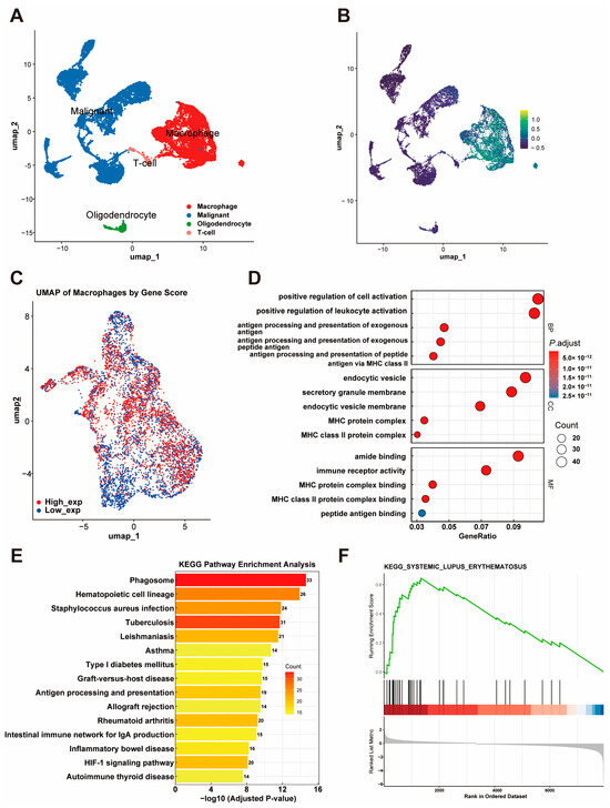 Furthermore, we extracted macrophages and conducted a deeper analysis. A UMAP visualization of macrophages stratified by the gene signature score revealed distinct high-expression and low-expression groups (Figure 6C). A differential expression analysis of macrophages with a high and low expression of the gene signature identified significant DEGs, which were subsequently used for a functional enrichment analysis. The GO enrichment analysis further revealed their involvement in processes like the positive regulation of leukocyte activation, cellular components like endocytic vesicles, and molecular functions such as MHC class II protein complex binding (Figure 6D). The KEGG pathways showed that these genes are involved in critical immune-related pathways, including phagosome formation, antigen processing and presentation, and hematopoietic cell lineage (Figure 6E). In addition, the GSEA revealed a significant association between the identified DEGs and the systemic lupus erythematosus (SLE) pathway, as indicated by a high enrichment score and statistical significance (Figure 6F).