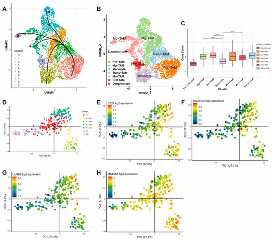 To investigate the transitional relationships among these subtypes, pseudotime trajectory analysis was performed using “Slingshot (version 2.6.0)” [27] R package. UMAP embeddings and Seurat cluster identities were used as inputs, and the starting cluster was determined based on the pseudotime distribution shown in the analysis (Supplementary Figure S5). This trajectory analysis revealed two additional transition-state subtypes—Pre-TAM and Trans-TAM (Supplementary Figure S6).