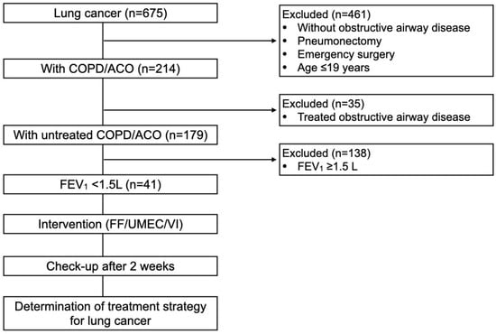 Among 675 lung cancer patients, 214 (31.7%) had COPD/ACO, of whom 35 (16.4%) that had undergone treatment interventions were excluded from this study. Of the remaining 179 patients, 41 had an FEV1 < 1.5 L (Figure 1, Table 1).