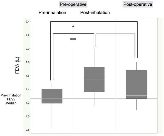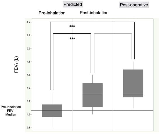 Comparison of perioperative FEV1 levels before and after single-inhaler triple therapy in lung cancer patients who underwent anatomical lung resection. In all patients who underwent anatomical lung resection, there was a significant increase in FEV1 post-inhalation therapy compared to that pre-inhalation therapy. The FEV1 at 3 months postoperatively was significantly better than pre-inhalation therapy levels. * p < 0.005 and *** p < 0.001, FEV1, forced expiratory volume in 1 s.