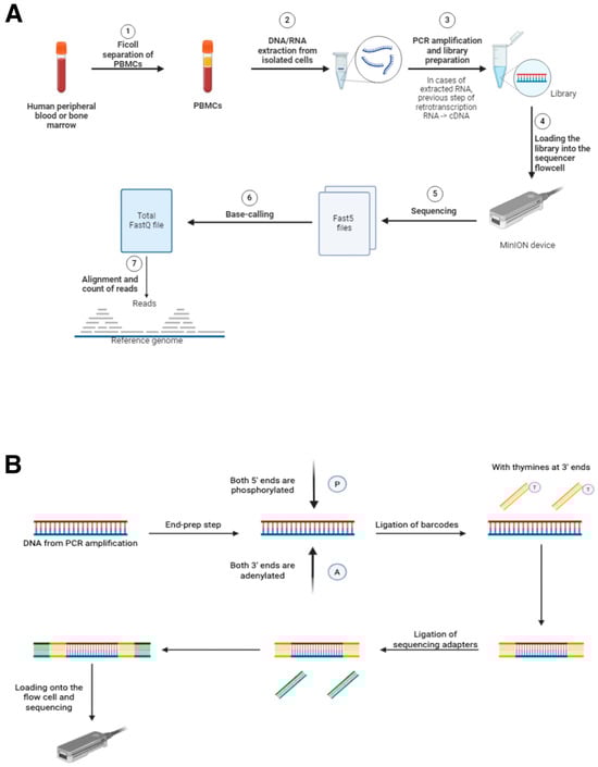 (A) Workflow for the use of MinION as a diagnostic tool in oncohematology. Steps 5, 6, and 7 require the use of MinKNOW software and are necessary for sequencing analyses. (B) Schematic figure showing the library preparation process for sequencing with MinION. The use of barcodes is necessary in the case of multiplexing, where multiple samples will be sequenced at the same time in a single sequencing run. All the reagents required for these steps are provided by ONT in their sequencing kits. (Figure 1 has been created manually using the BioRender application (“https://www.biorender.com/”. Accesed date 23 May 2025).