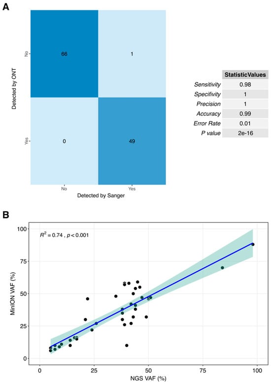 Figure 2 highlighted the strong correlation observed between the results obtained using MinION and those generated by Sanger-NGS. This demonstrates the high level of agreement between the two technologies in our analysis, underscoring the reliability and accuracy of MinION in comparison with the established methods. Out of the 174 analyzed sites (comprising the total regions of interest across the 164 samples under study), only one discordant result was observed, reflecting a concordance rate of 99.43% (173/174) between the gold standard technique and the proposed method. When comparing the presence or absence of specific variants between Sanger and MinION-ONT, the statistical analysis demonstrated high accuracy, sensitivity, and specificity, all supported by a significant p-value (Figure 2A). In the comparison of VAF values, a strong correlation was observed between the different approaches, demonstrating that the differences between short-reads and long-reads are not significant in VAF detection (Figure 2B).