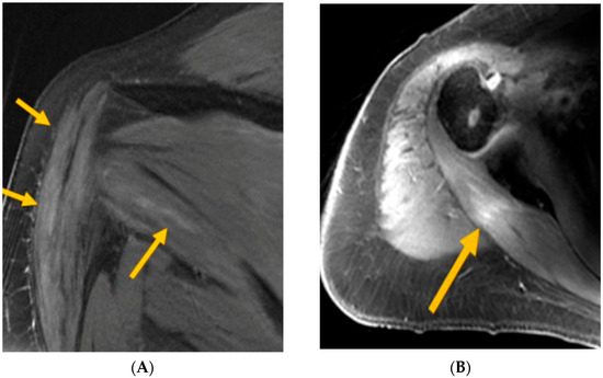 (A) MRI T2FS—arrows indicate deltoid and teres minor intramuscular edema (consistent with axillary neuropathy); (B) MRI T1FS—arrow indicates post-infraspinatus enhancement (consistent with upper trunk brachial plexopathy).