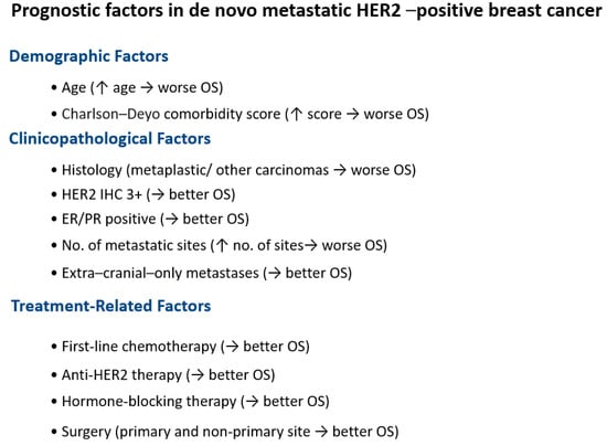- Murthy, P.; Kidwell, K.M.; Schott, A.F.; Merajver, S.D.; Griggs, J.J.; Smerage, J.D.; Van Poznak, C.H.; Wicha, M.S.; Hayes, D.F.; Henry, N.L. Clinical predictors of long-term survival in HER2-positive metastatic breast cancer. Breast Cancer Res. Treat. 2016, 155, 589–595. [Google Scholar] [CrossRef]
