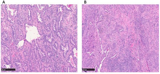 Representative images of (A) acinar-predominant and (B) acinar component; non-acinar-predominant LUAD with an acinar component of ≥5%.